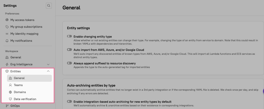 * Configure automatic archival for entities that are no longer detected in your integrations or whose YAML files have been deleted. Learn more in [Auto archiving entities](https://docs.cortex.io/configure/settings/entity-settings/auto-archive).