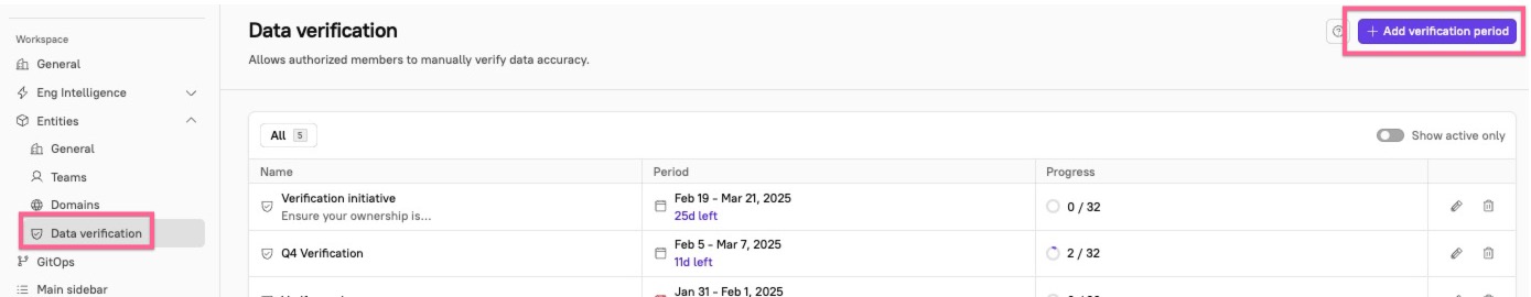 You can see the list of all verifications in the [Entity verification settings](https://app.getcortexapp.com/admin/settings/entities/verification) page. At a glance, see the status, time period, and progress for each verification.