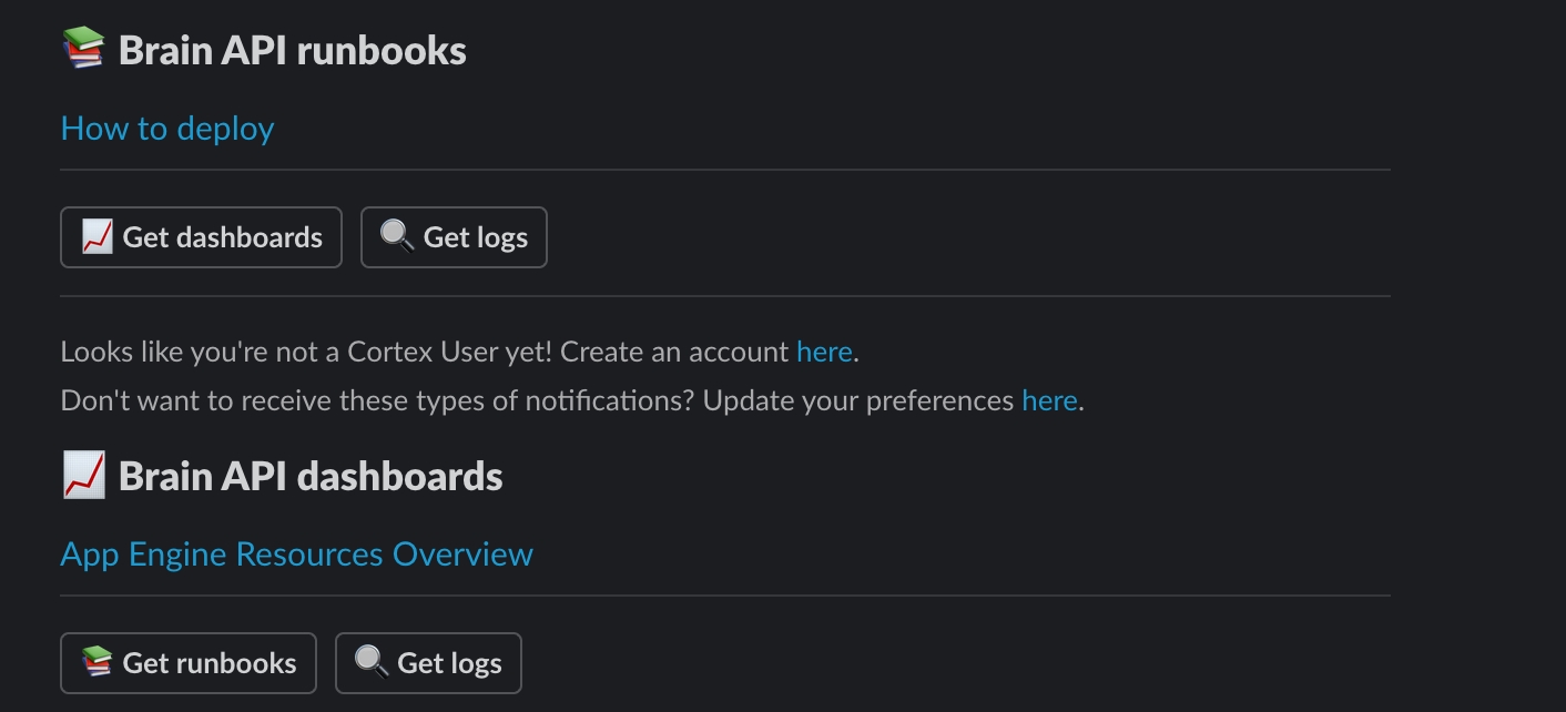 Cortex’s On-call Assistant leverages the PagerDuty integration to automatically surface the most vital information about entity health and metadata when an incident is triggered. On-call Assistant notifies the user(s) responsible for an incident via Slack, including information about the affected entity, recent deployments, ownership, and links to get more details, including dependencies, runbooks, and logs.