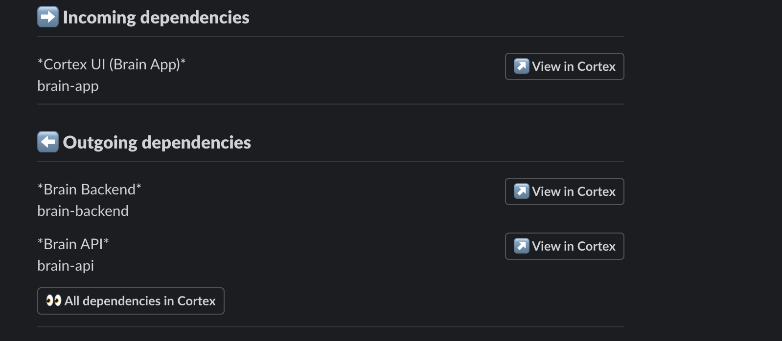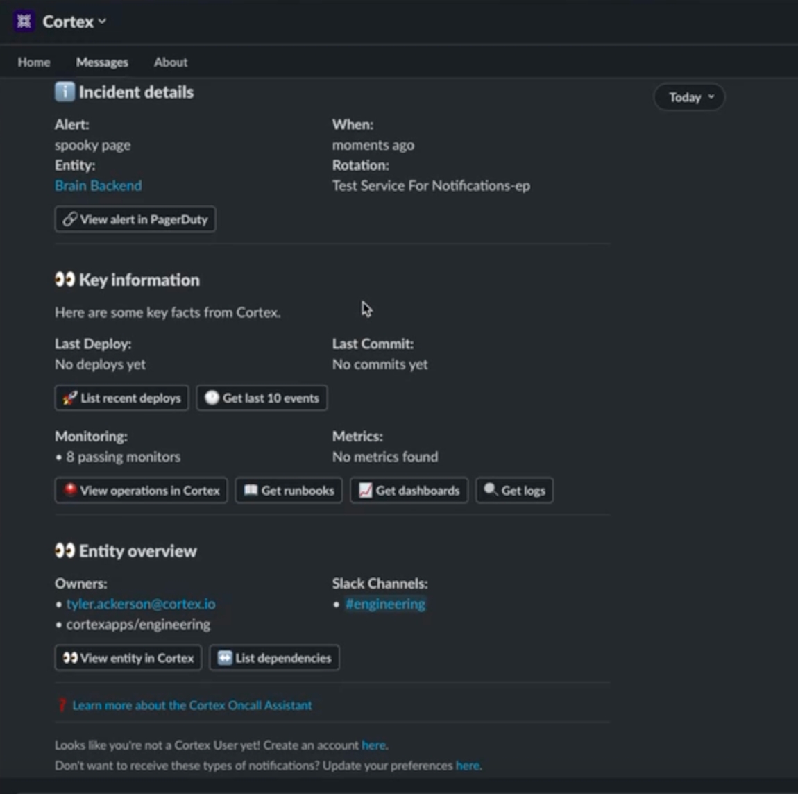 Developers can access entity information that is already in Cortex directly from the Slack notification to quickly resolve issues. On-call Assistant provides a direct link to view the alert in PagerDuty, so you can also quickly access the incident from its source.