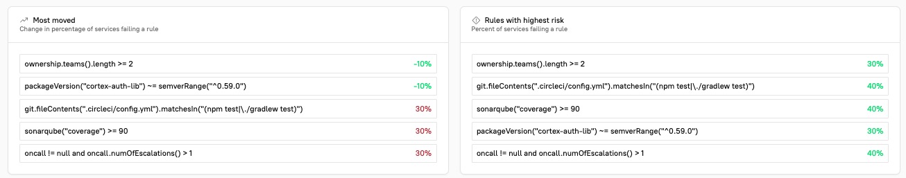 Rules with highest risk shows the rules with the lowest passing rates. This section shows the rule definition and the percent of entities failing a given rule.\