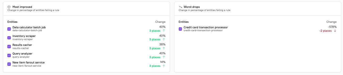 Most improved shows up to five entities that have improved the most in the selected Scorecard. This section shows each entity's name, tag, and score. You can also see how many places each entity has moved in rank among all entities.