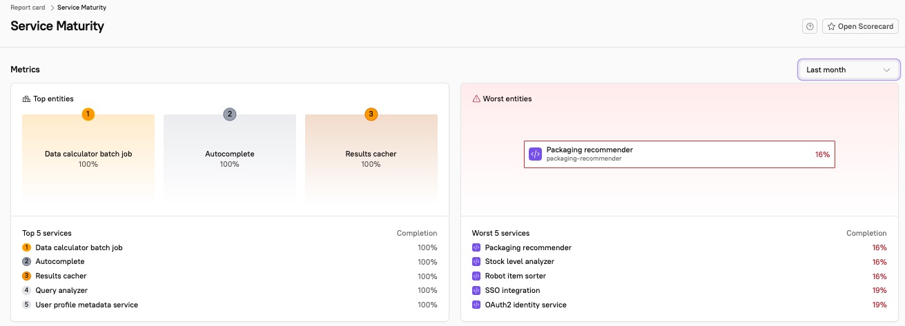 Top entities shows up to five entities with the highest scores in the selected Scorecard. This section shows each entity's name, tag, and score.