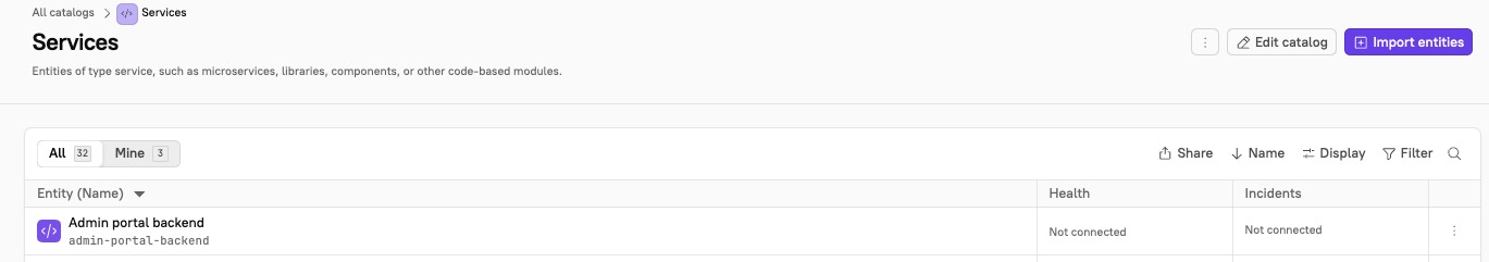 When you open the Services page, you'll see tabs labeled **Mine** and **All**, which denote services you own and all services visible to you in your Cortex workspace.