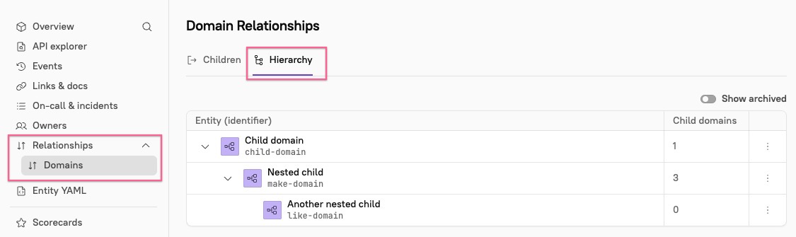 <figure><img src="https://826863033-files.gitbook.io/~/files/v0/b/gitbook-x-prod.appspot.com/o/spaces%2FJW7pYRxS4dHS3Hv6wxve%2Fuploads%2Fgit-blob-b56c8121cad8189ab1c9434498acf97be007d79d%2Fdomain-hierarchy-view.jpg?alt=media" alt=""><figcaption><p>The hierarchy appears in a domain's "Relationships" section.</p></figcaption></figure>