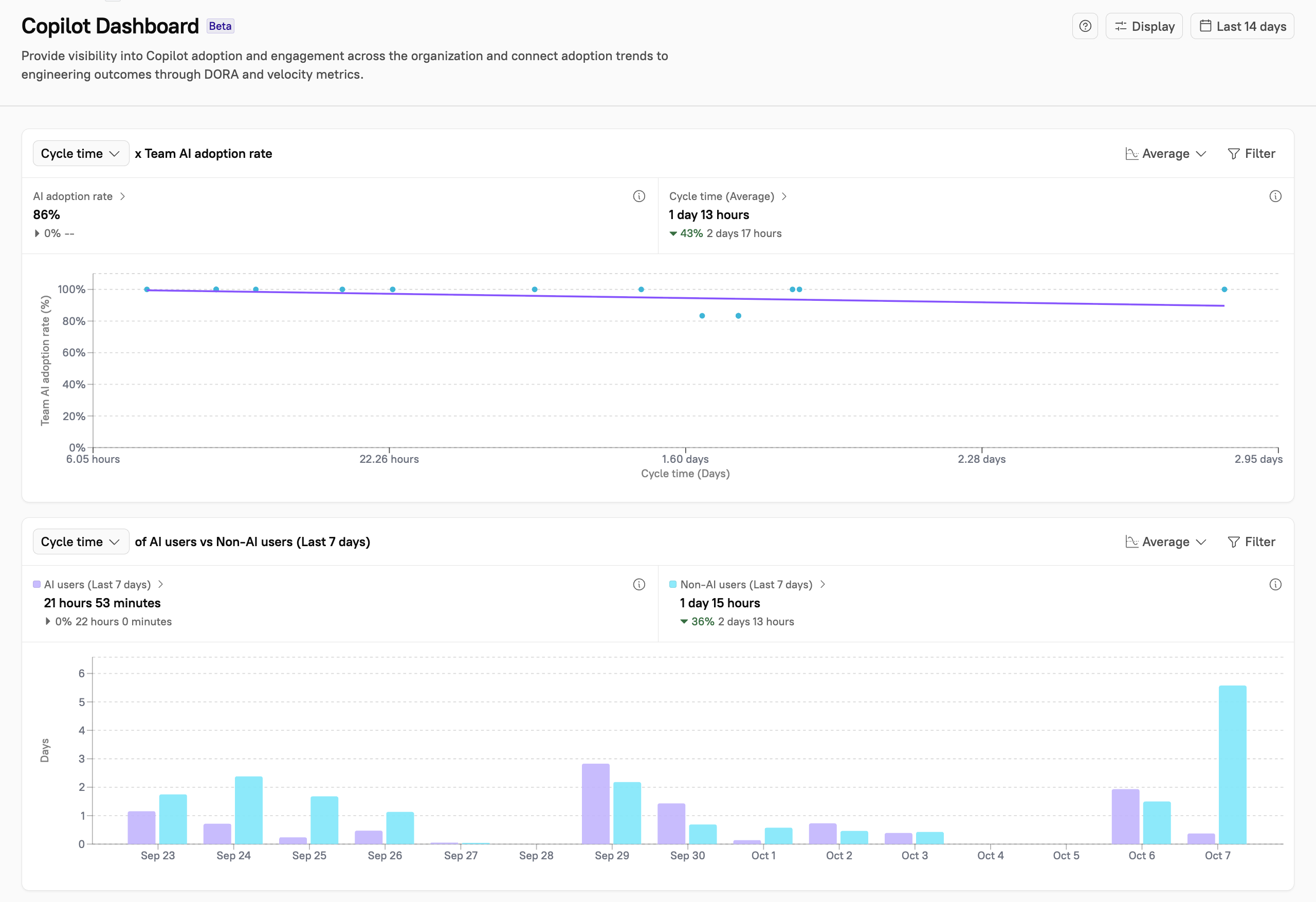Compare delivery and reliability side-by-side between users who leveraged AI tools within the last 7 days, and those who did not. Understand whether recent AI usage affects engineering performance. Choose between different performance metrics by using the dropdown on the top right area of this chart.
