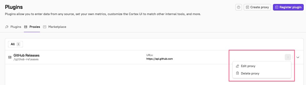 You can view your plugin proxies in **Plugins** under the [Proxies tab](https://app.getcortexapp.com/admin/plugins?activeTab=Proxies).