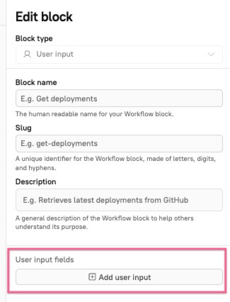* You can enter a simple string or use templating for a more dynamic message. For example, you can templatize to include the email address of the person who initiated the Workflow, reference prior blocks, or reference outputs.