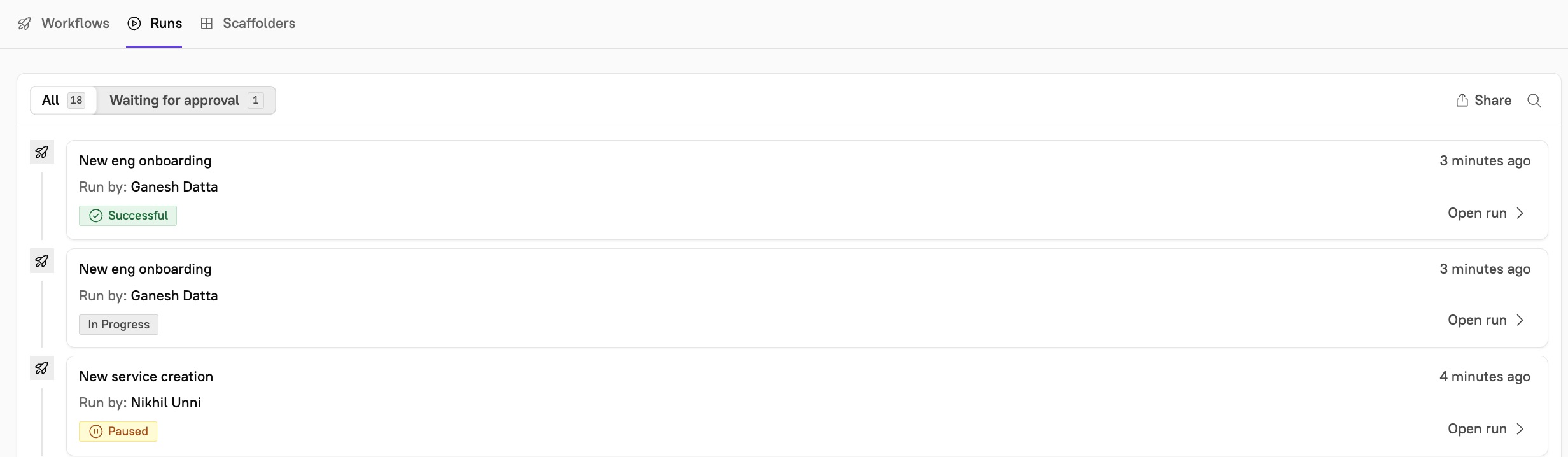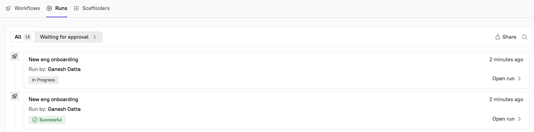 When a run has been started, it appears in the Runs tab on the Workflows page with a "Successful" label. A Workflow awaiting input or approval will display as "Paused," and a Workflow that is currently running will display as "In progress."