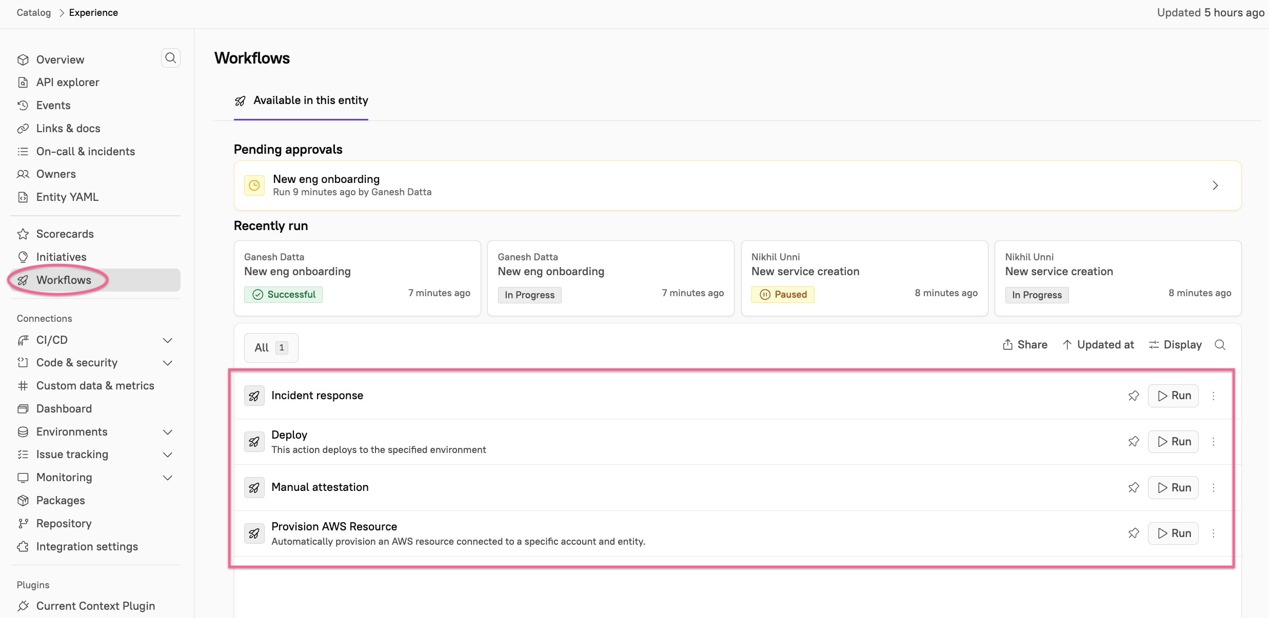 Your recently run Workflows are displayed at the top of the [Workflows page in Cortex](https://app.getcortexapp.com/admin/workflows):