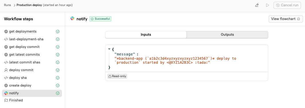 Click into one of the recent runs to view the step-by-step progress of the Workflow and each step's inputs and outputs: